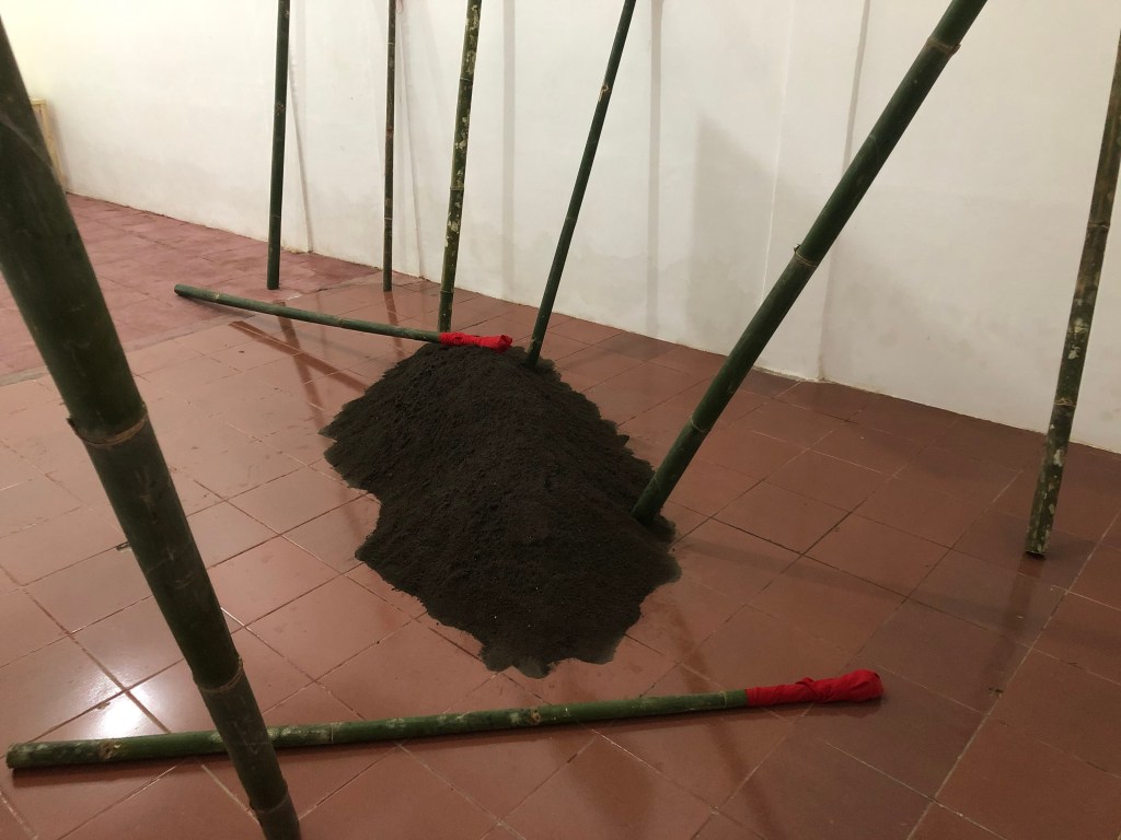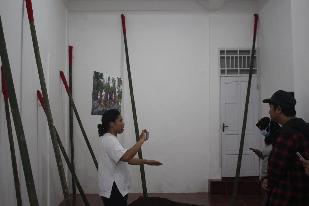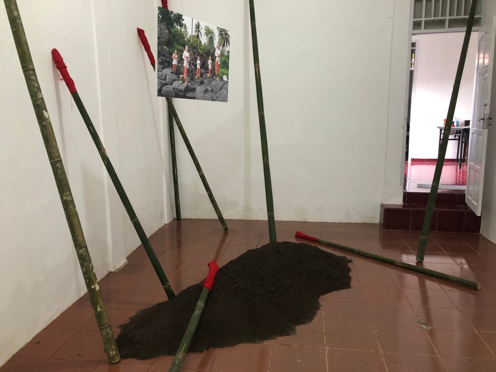 Entering the room you see long bamboo sticks laying on the floor and leaning against the walls. Red cotton is wrapped around their top. In the middle on the floor, there is a big heap of black sand and half above this, free hanging in space between the sticks you see a photo of five young women. The women wear Adat costumes and several Adat objects are laying next to them on the rocks. The group stands on the shore of uninhabited Karaka Island. The women have a troubled look, they stand waiting and stare into the distance. The eyes of two of them confront the public, what’s happening? This Island, a big rock, has been called Women island in the past and lays opposite of Lautaka on Banda Naira. If you put on the headphones you will hear the song. A simple gambalan sound can be heard from the other room.