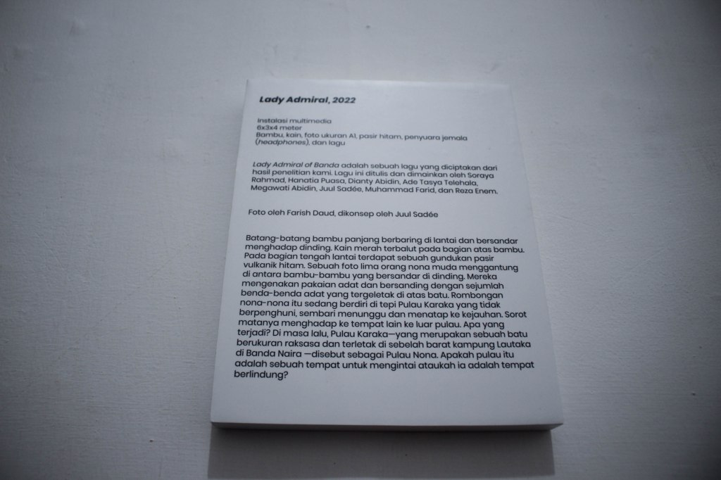 Di dinding ada esai tentang ‘Lady Admiral’, yang ditulis oleh Muhammad Farid dan Juul Sadée. Esai ini menunjukkan kekayaan sejarah Banda. Ini tentang realitas paralel; cerita yang diceritakan, diteliti dan ditulis dari berbagai perspektif seperti lokasi, asal usul, agama, budaya, momen dalam waktu, dan apa manfaat narator/penulis atau pendengarnya.